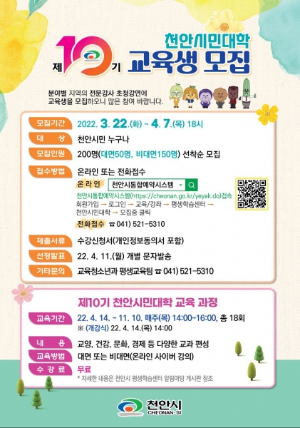 박상돈 천안시장은 “교육환경 변화에 맞춰 시민들의 행복한 배움과 가치 있는 성장을 위해 천안시민대학을 운영하게 됐다”며 “앞으로도 만족도 높은 강좌와 평생학습 콘텐츠 개발을 위해 노력하겠다”고 말했다.