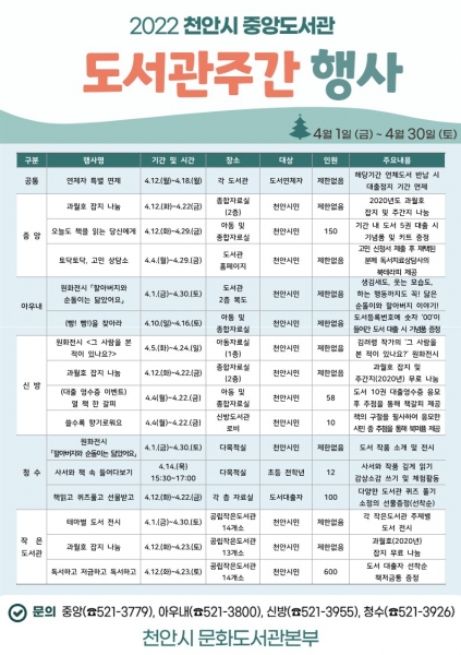 [세종타임즈] 천안시 중앙도서관이 제58회 도서관주간을 맞아 중앙·아우내·신방·청수·작은도서관에서 4월 한 달간 다채로운 행사를 운영한다.