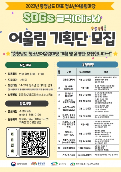 [세종타임즈] 천안시태조산청소년수련관이 2022년 충청남도 대표 청소년어울림마당 ‘SDGs 청소년, 클릭’을 운영함에 따라 청소년 소통 창구를 열어줄 ‘어울림 기획단’을 모집한다.