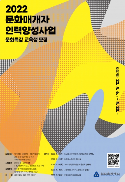 [세종타임즈] 천안문화재단이 창의적인 지역문화 인재 발굴과 시민 주체적 문화생태계 조성을 위한 ‘2022년 문화매개자 인력양성사업’을 추진하는 가운데 ‘문화특강’ 프로그램 교육생을 모집한다.