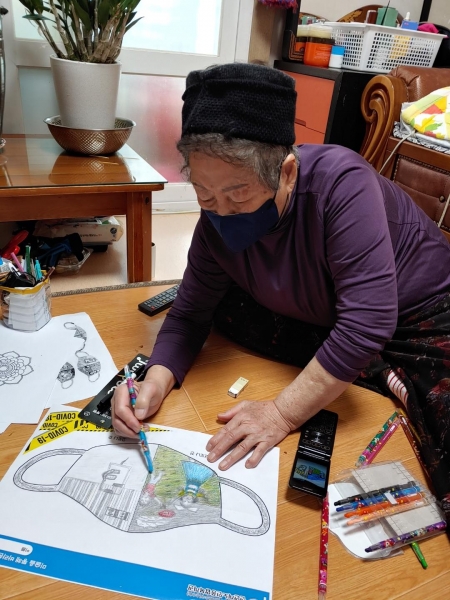 미술프로그램은 참여 어르신이 코로나 상황 전후 일상을 그림으로 표현한 작품을 전시하는 프로그램으로 그림을 매개로 어르신 자존감 회복 및 사회참여 독려 등을 도모하고 우울감과 고독감 예방에 큰 도움을 주고 있다.