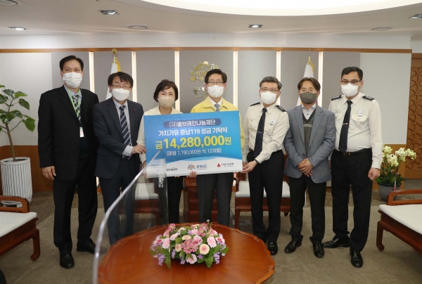 [세종타임즈] 충남소방본부는 공주에 공장을 두고 있는 솔브레인 홀딩스의 솔브레인 나눔재단이 어려운 이웃을 위해 써 달라며 ‘가치가유 119’에 성금 1428만원을 기탁했다고 13일 밝혔다.