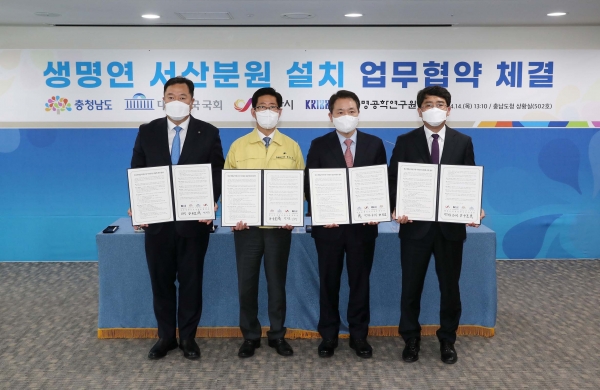 협약에 따르면, 도와 국회, 서산시, 생명연은 바이오 경제 시대를 주도해 나아갈 생명공학 분야 연구개발, 관련 사업 육성·발전 등을 위해 생명연 서산분원을 조성키로 뜻을 모았다.