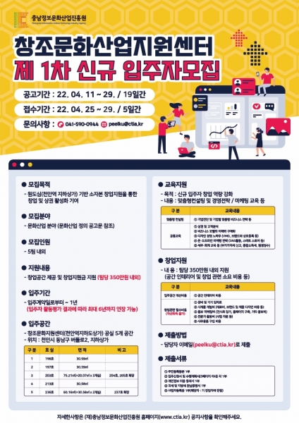 [세종타임즈] 천안시와 충남정보문화산업진흥원은 오는 29일까지 천안역지하도상가 내 창조문화산업지원센터 신규 입주자를 모집한다고 밝혔다.