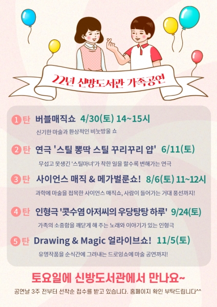 올해 신방도서관 가족공연 프로그램은 작년 코로나로 비대면으로 진행해 많은 아쉬움을 남겼던 버블쇼, 연극 등을 방역수칙이 완화됨에 따라 직접 보고 체험할 수 있는 대면 공연으로 진행할 예정이다.