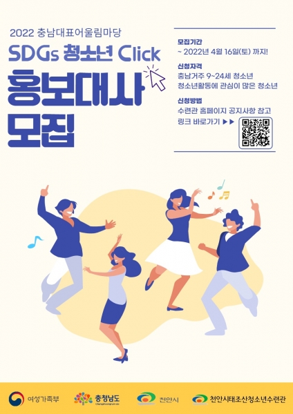 [세종타임즈] 천안시태조산청소년수련관은 2022년 충청남도 대표 청소년어울림마당 ‘SDGs 청소년, 클릭’을 더욱 빛나게 해줄 홍보대사를 모집한다.