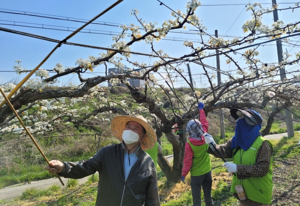 배꽃은 개화 시기가 짧아 인공수분 작업을 위해 일시적으로 많은 인력이 필요한 만큼 많은 회원들이 나서 함께 힘을 모아 일손을 도왔다.