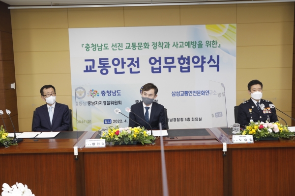 위원회와 도경찰청, 연구소는 21일 도경찰청 중회의실에서 권희태 위원장, 노승일 도경찰청장, 황인철 삼성화재해상보험 부사장 등이 참석한 가운데, ‘교통사망사고 감소와 교통문화·안전지수 향상을 통한 선진교통문화 정착과 안전한 충남’을 위한 업무협약을 체결했다.