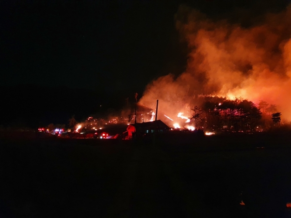 도 소방본부에 따르면 이날 불은 오전 2시 11분쯤 장곡면 광성리에서 발생했으며 순간풍속 6m/s의 강한 바람을 타고 주변으로 급속히 확산했다.