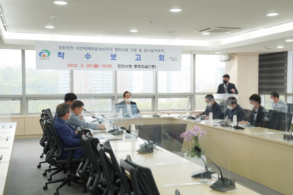 시는 25일 시청 중회의실에서 박상돈 시장 등 관계 공무원 10명이 참석한 가운데 성환장천 자연재해위험개선지구 정비사업 기본 및 실시설계용역 착수보고회를 진행했다고 밝혔다.
