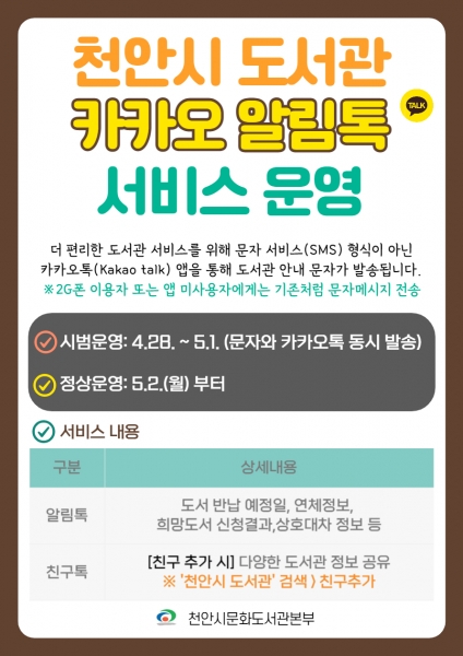 도서관은 정보전달에 한계가 있는 기존 문자전송을 대신해 카카오 알림톡 서비스 도입으로 도서대출과 반납 관련 안내메시지를 발송하고 친구추가를 한 회원들에게는 각종 공지사항, 문화행사, 도서 정보 등도 제공한다.
