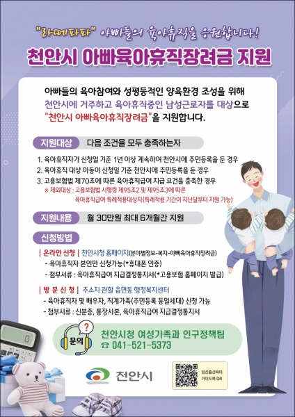 충남 최초 ‘천안시 아빠 육아휴직장려금’은 천안시가 남성 근로자의 육아휴직을 장려하고 성평등적인 양육환경 조성을 위해 정부의 육아휴직 급여와는 별도로 육아휴직 중인 남성 근로자에게 월 30만원씩 최대 6개월 동안 장려금을 지원한다.