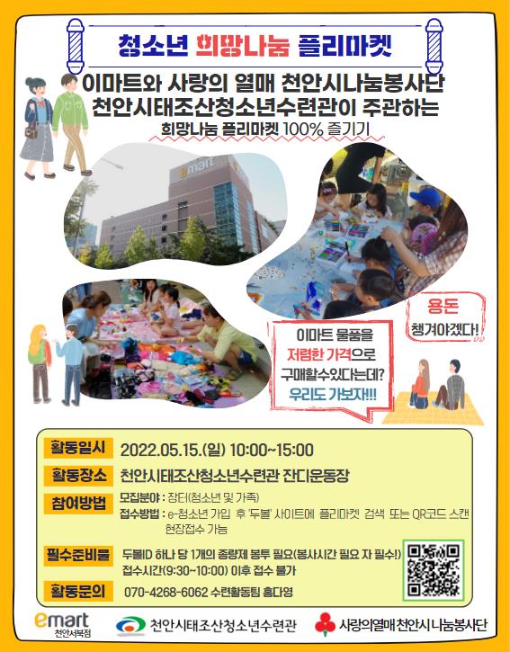 [세종타임즈] 천안시태조산청소년수련관은 오는 15일 이마트 천안 서북점, 사랑의 열매 과 함께 ‘희망나눔 플리마켓’을 진행한다.