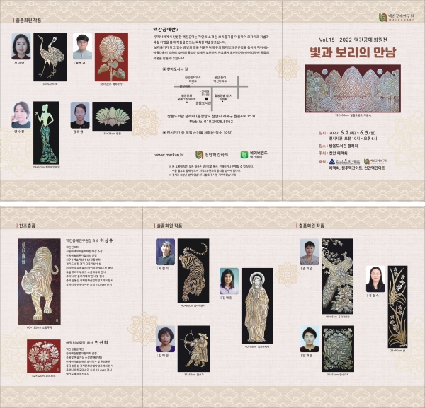이번 전시는 천안예맥회 맥간공예 동아리 회원 11명이 위드코로나로 넘어가는 길목에 임인년 호랑이의 기운으로 나쁜 것을 지우고 희망과 평안 등을 담아 희망찬 미래를 바라는 마음으로 준비한 30여 점의 작품을 전시한다.