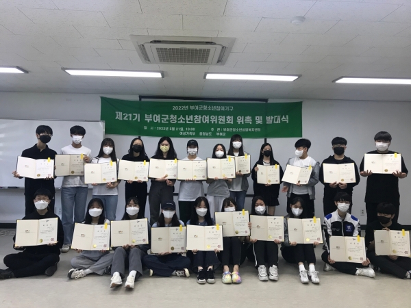부여군 청소년참여위원은 청소년기본법에 근거해 부여군수의 위촉장을 받아 앞으로 1년 동안 지역 청소년을 대표해 인권, 교육, 문화, 환경, 복지 등 다양한 분야 청소년 정책을 제안하게 된다.