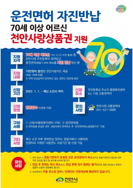 신청 대상은 신청일 기준 만 70세 이상 고령 운전자이며 운전면허를 자진 반납하면 10만원을, 면허반납일 현재 운전을 직접하고 있는 경우에는 30만원이 충전된 천안사랑카드를 인센티브로 받을 수 있다.