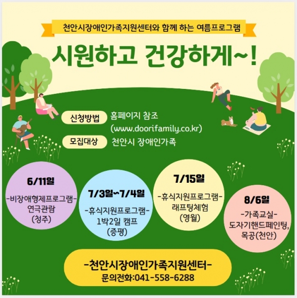 [세종타임즈] 천안시장애인가족지원센터는 여름을 맞아 ‘시원하고 건강하게~’라는 주제로 운영하는 다양한 프로그램에 참여할 장애인과 장애인 가족을 모집한다고 밝혔다.