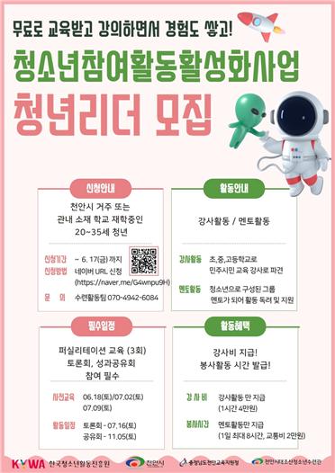 [세종타임즈] 천안시태조산청소년수련관은 지역사회 청소년 참여활동 활성화 사업의 멘토강사 ‘청년리더’를 오는 17일까지 모집한다고 밝혔다.
