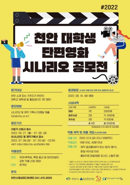 [세종타임즈] 천안시가 천안지역 대학생들의 영화제작 여건 조성 및 인재 육성을 위한 ‘2022 천안 대학생 단편영화 시나리오 공모전’을 운영한다.