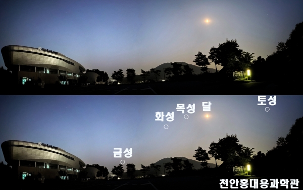 천안홍대용과학관은 지난 21일 새벽 4시경 금성과 화성, 목성, 달, 토성이 일렬로 나열된 행성정렬 모습을 촬영하는 데 성공했다고 밝혔다.