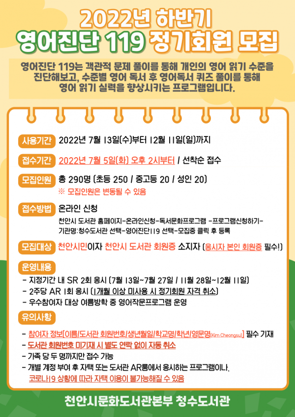 [세종타임즈] 천안시 청수도서관은 다음 달부터 운영 예정인 하반기 ‘영어진단 119’ 정기회원을 모집한다고 밝혔다.