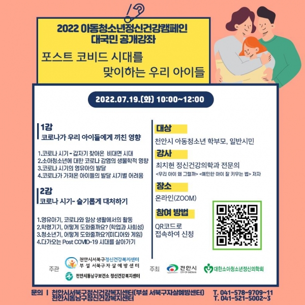 [세종타임즈] 천안시 보건소와 천안시 정신건강복지센터는 ‘코로나 시대 우리 아이들의 마음건강 돌보기’를 주제로 오는 19일 비대면으로 아동·청소년 정신건강 세미나를 공개강좌로 개최한다.
