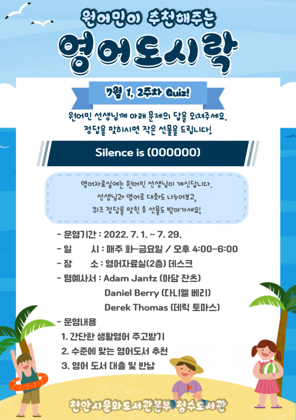 [세종타임즈] 천안시 청수도서관은 7월과 8월 두 달 동안 ‘여름방학 원어민이 추천해주는 영어도시락’을 운영한다.