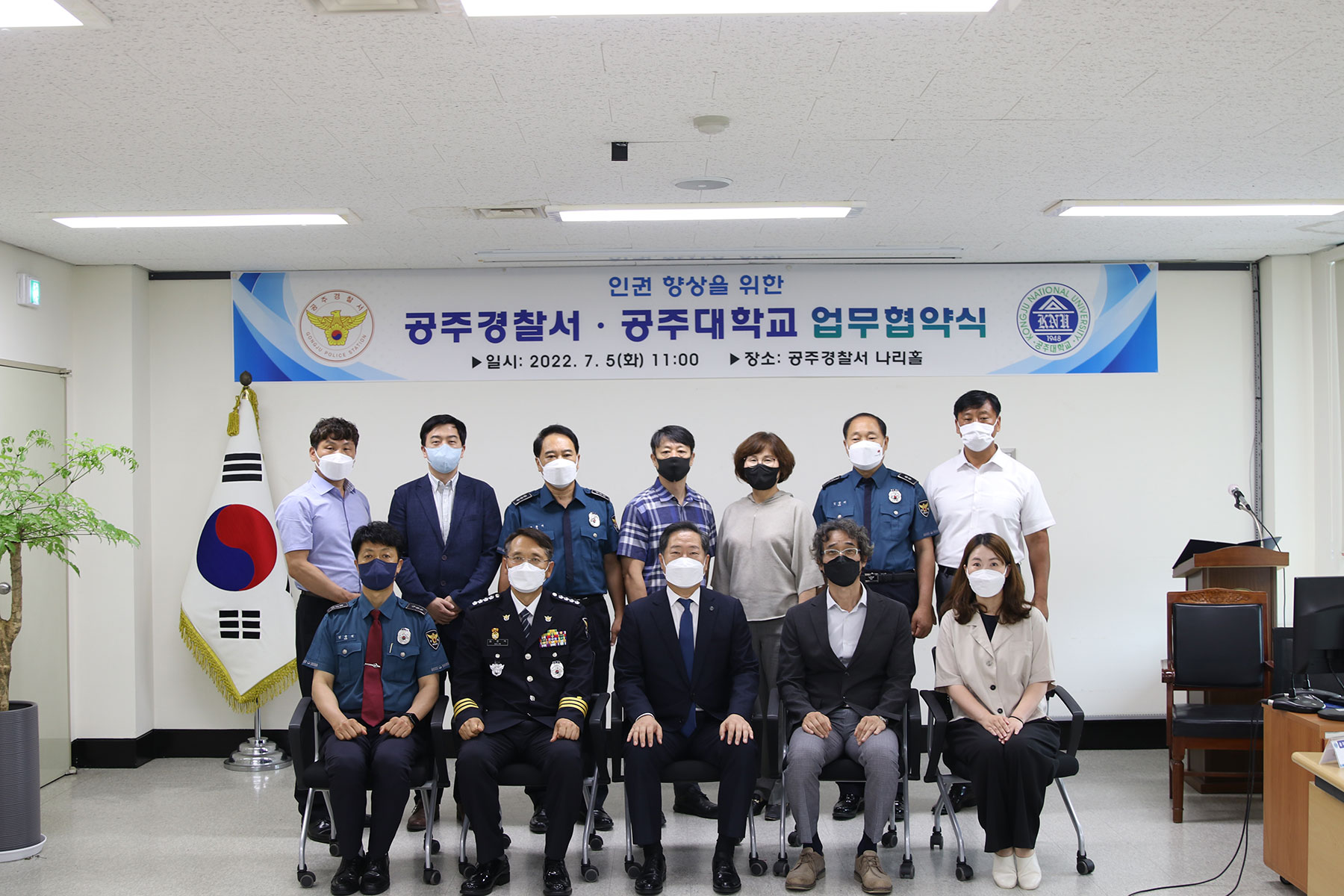 5일 공주경찰서 나리홀에서 열린 이날 체결식에는 원성수 총장, 심은석 서장, 이기형 인권센터장, 최순자 청문감사인권관, 양 기관 관계자 등 15명이 참석했다.