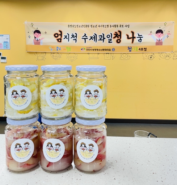 [세종타임즈] 천안시가 설립하고 호서대학교가 수탁·운영하는 성정청소년문화의집 청다움 4호점이 지난 22일 수제과일청 나눔 봉사를 진행했다.