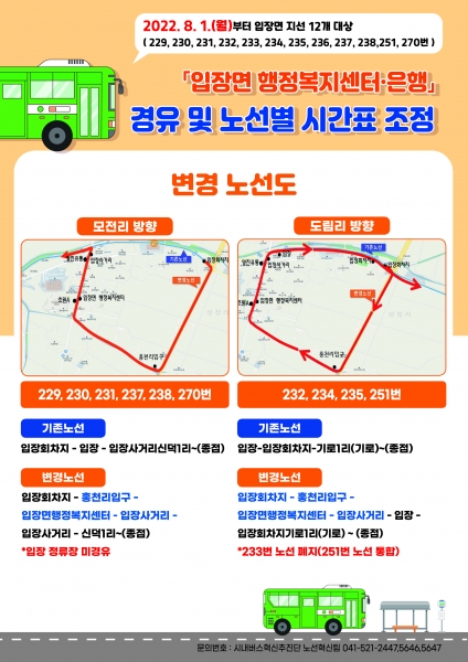 시 관계자는 “이번 입장면 노선 개편을 통해 입장면 주민들의 숙원이였던 입장면 중심생활권 경유 민원을 해소하게 되어 매우 기쁘게 생각한다”며 “지속적으로 시민들의 교통 편의를 반영한 노선 개편안 마련에 최선을 다하겠다”고 말했다.