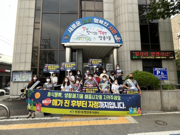 이날 캠페인은 쌍용1동 상가 밀집지역을 중심으로 상가가 여는 시간에 맞춰 소상공인 등을 직접 방문해 홍보 전단지를 배부하고 올바른 생활폐기물 배출 방법에 대해 알렸다.
