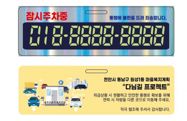 이에 마을복지계획 추진단은 원성1동 주민 차량임을 나타내는 주차알림판을 제작·배부해 누구나 위급상황 시 신속하게 연락망을 확보할 수 있는 ‘다님길 프로젝트’ 사업을 실시한다.