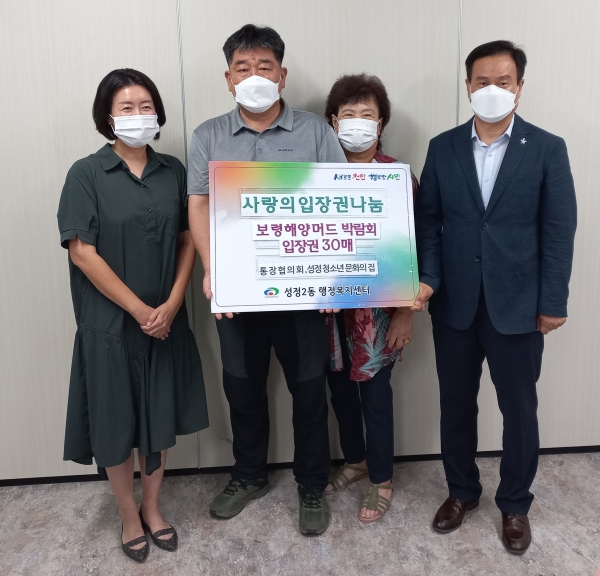 [세종타임즈] 천안시 성정2동은 지난 4일 보령해양머드박람회 입장권 30매를 성정2동 통장협의회로부터 기부받아 성정청소년문화의집에 전달했다고 밝혔다.