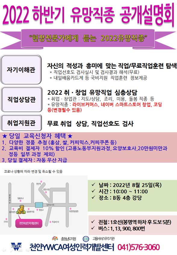 [세종타임즈] 천안여성인력개발센터는 오는 25일 오전 10시 센터 4층 강당에서 ‘2022년 하반기 유망직종설명회’를 개최한다.