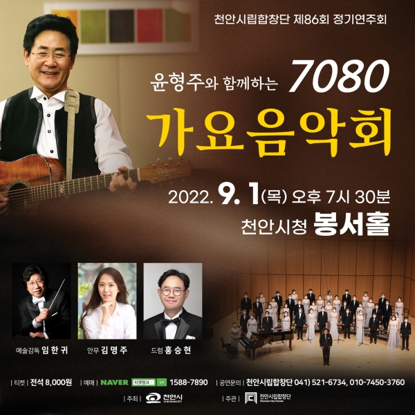 [세종타임즈] 천안시립합창단은 가수 유형주와 함께하는 7080 가요음악회를 9월 1일 오후 7시 30분 천안시청 봉서홀에서 개최한다.