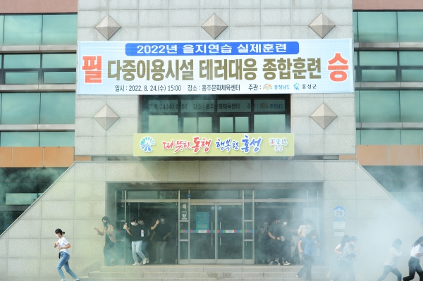 [세종타임즈] 홍성군은 지난 24일 홍주문화체육센터에 테러범의 폭발물 투척으로 폭발이 일어나 건물이 일부 파손되고 총기 난사 및 화재로 사상자가 발생한 급박한 상황을 가정 2022년 을지연습 테러 대응 종합훈련이 실시했다.