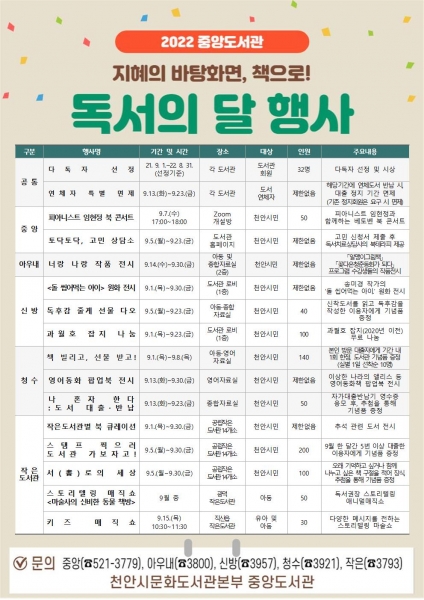 독서의 달 행사는 천안시 8개 공공도서관과 14개 공립작은도서관에서 운영된다.