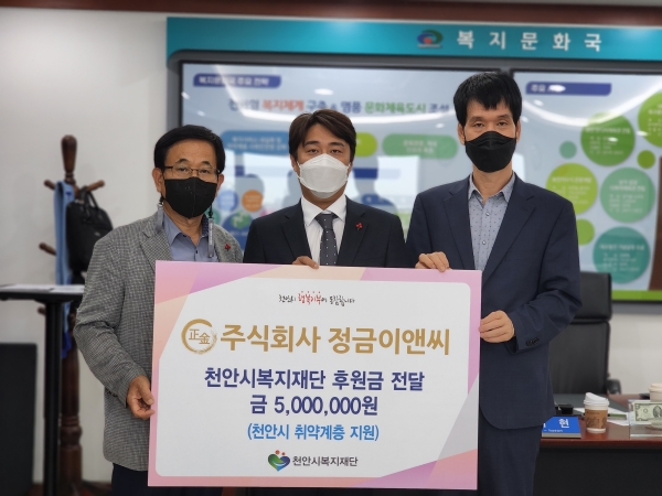 [세종타임즈] 천안시와 천안시복지재단은 지난 25일 주식회사 정금이앤씨가 천안시청에서 취약계층 지원을 위한 후원금 500만원을 기부했다고 밝혔다.