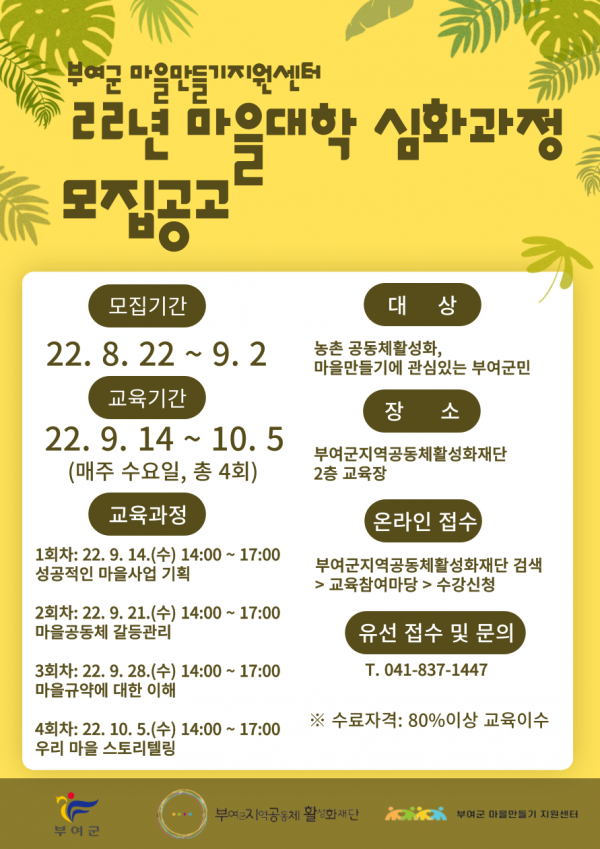 [세종타임즈] 부여군 지역공동체활성화재단에서 운영하는 마을만들기 지원센터가 ‘마을대학 심화과정’을 연다.