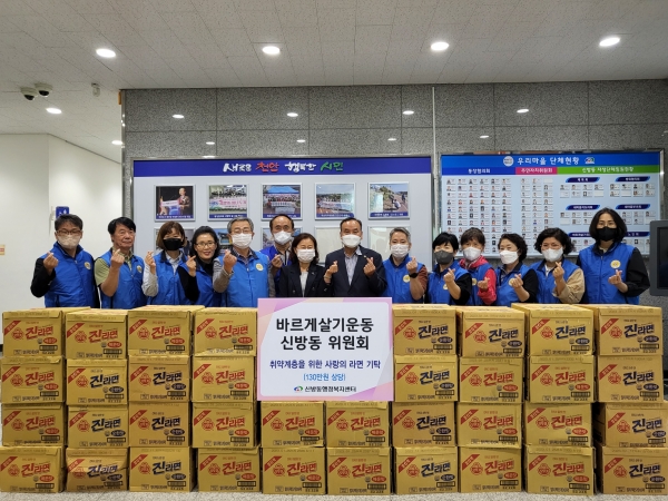 [세종타임즈] 천안시 바르게살기운동 신방동위원회는 지난 8월 31일 오후 추석 명절을 맞아 취약계층을 위해 라면 50박스를 기부했다.