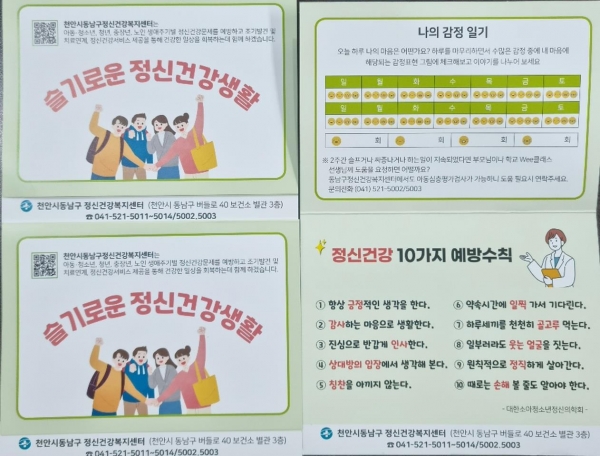 한편 천안시동남구정신건강복지센터와 천안시서북구정신건강복지센터는 아동청소년의 마음건강을 위해 고위험군을 위한 사례관리 아동·청소년 심층평가 고위험군 치료비지원 찾아가는 심리치료프로그램‘힐링스쿨’ 부모심리치료 집단상담 ‘내 삶의 주인공은 나야 나’학교로 찾아가는 ‘슬기로운마음건강캠페인’, ‘정신건강·자살예방교육’ 등을 시행하고 있다.