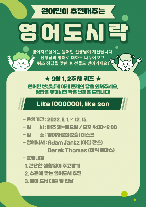 원어민이 추천해주는 영어도시락은 매주 화~토, 오후 4시~6시 두 시간 동안 원어민이 영어 자료실에서 명예사서로 근무해 간단한 생활영어를 주고받거나 2주마다 변경되는 간단한 퀴즈를 맞히면 상품을 받을 수 있는 프로그램이다.