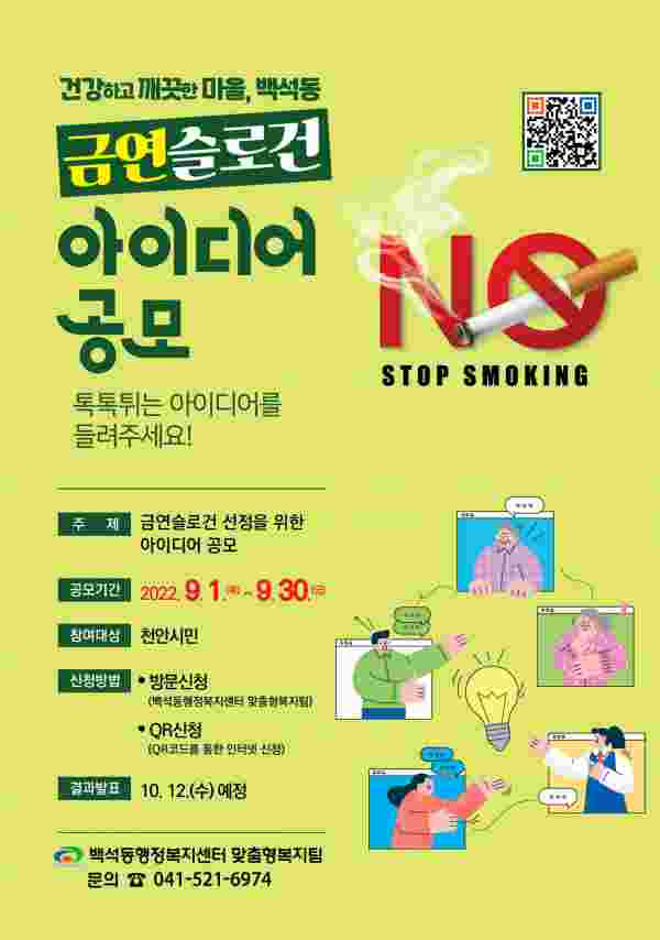 [세종타임즈] 천안시 백석동은 마을복지사업으로 건강하고 깨끗한 마을을 위해 간접흡연 예방 금연슬로건 홍보물 설치에 앞서 오는 30일까지 금연슬로건 아이디어를 모집한다고 밝혔다.