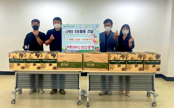 [세종타임즈] ㈜롯데푸드 천안공장은 지난 5일 부성2동을 방문해 어려운 이웃에 전달해 달라며 추석 맞이 식료품 20세트를 기부했다고 밝혔다.
