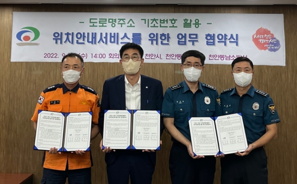 [세종타임즈] 천안시는 지난 14일 관내 도로명주소 기초번호를 활용한 위치안내서비스를 효율적으로 제공하고자 천안 동남경찰서 천안동남소방서와 업무협약을 체결했다고 밝혔다.