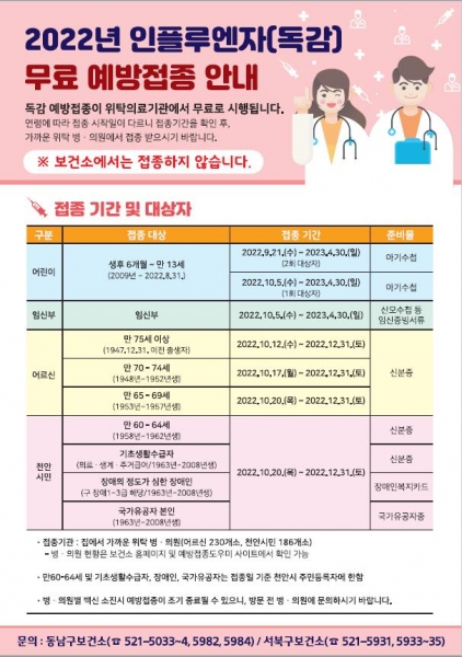 접종기관은 집에서 가까운 위탁 병·의원 230개소이며 병·의원 현황은 예방접종도우미 누리집 ‘의료기관 찾기’ 또는 서북구·동남구보건소 누리집에서 확인할 수 있다.