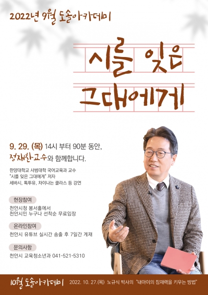 [세종타임즈] 천안시는 오는 29일 오후 2시부터 온·오프라인으로 ‘시를 잊은 그대에게’라는 주제의 정재찬 교수 초청 9월 도솔아카데미 강연을 진행한다.