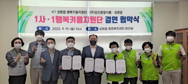 [세종타임즈] 천안시는 지난 19일 성환읍 행복키움지원단과 ㈜상신종합식품, 성환읍이 1사·1행복키움지원단 결연을 위한 협약을 체결했다고 밝혔다.