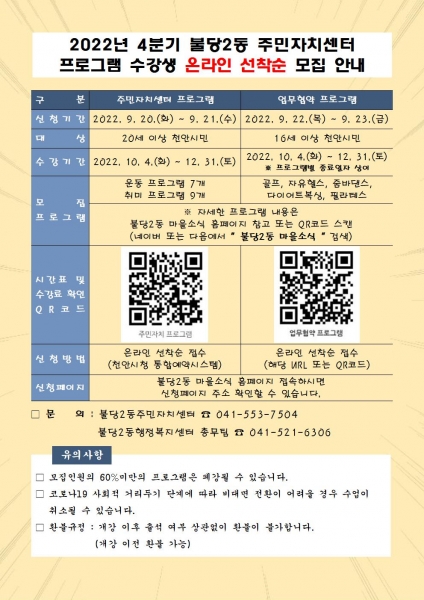 [세종타임즈] 천안시 불당2동 주민자치센터는 천안 주민자치센터 최초로 10월부터 12월까지 운영하는 4분기 프로그램 수강생을 온라인으로 선착순 모집한다.