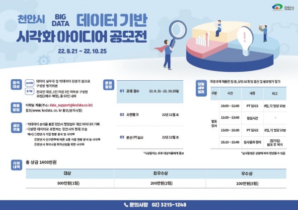 총상금 1400만원 규모의 이번 공모전은 빅데이터 분석을 통한 천안시 행정업무 개선 아이디어 기획 다양한 데이터로 표현하는 천안시의 현재 모습 등을 시각화로 구현한 아이디어를 선발한다.